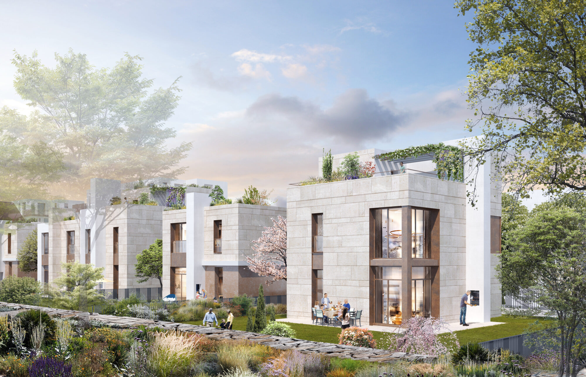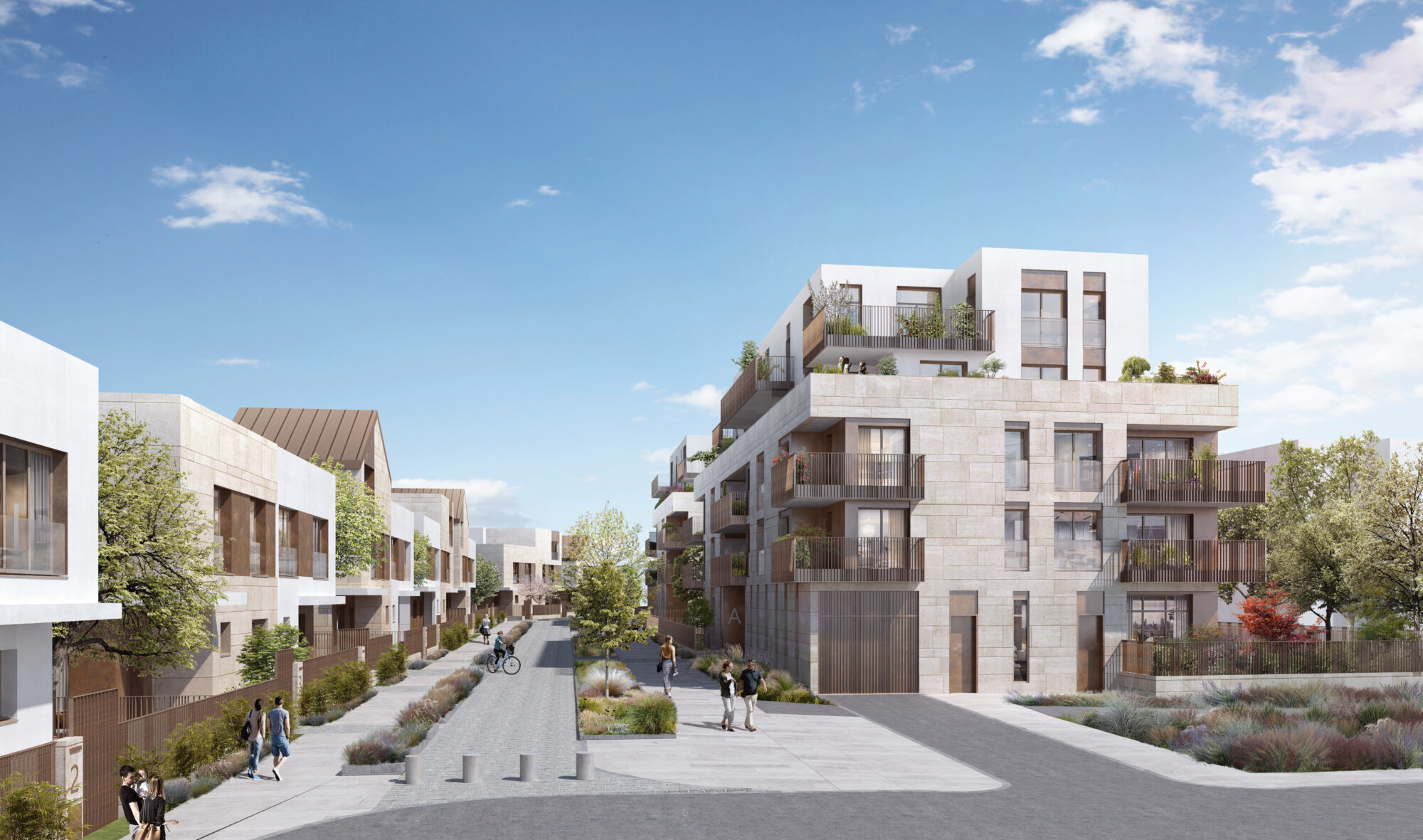 L’écriture architecturale privilégie des matériaux sobres et pérennes : une pierre calcaire lisse et un enduit gratté clair viennent établir un dialogue subtil entre les volumes collectifs et les typologies pavillonnaires.