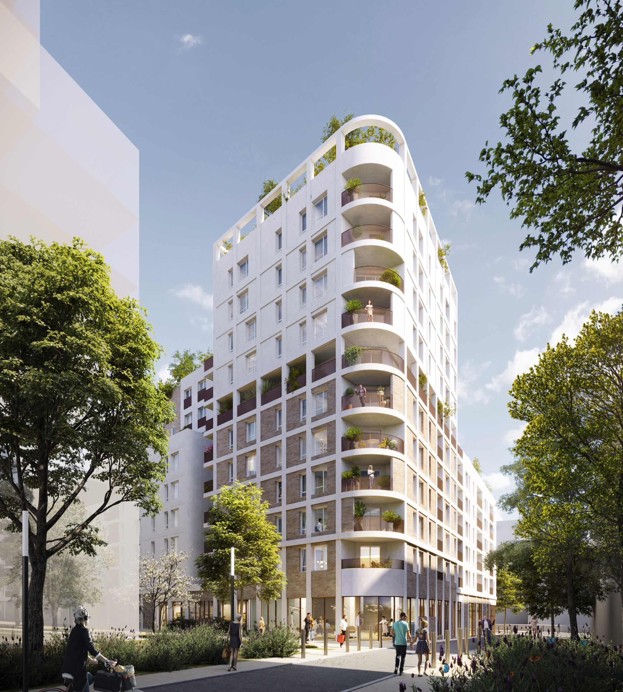 Avec ses 77 mètres de linéaire actif, le socle du projet renforce la visibilité des commerces et participe à l’animation de l’espace public. À l’articulation des îlots, une faille paysagère crée une respiration visuelle et assure la continuité verte du quartier, tandis qu’une émergence en R+10 marque symboliquement l’entrée ouest du parc et agit comme point de repère urbain.