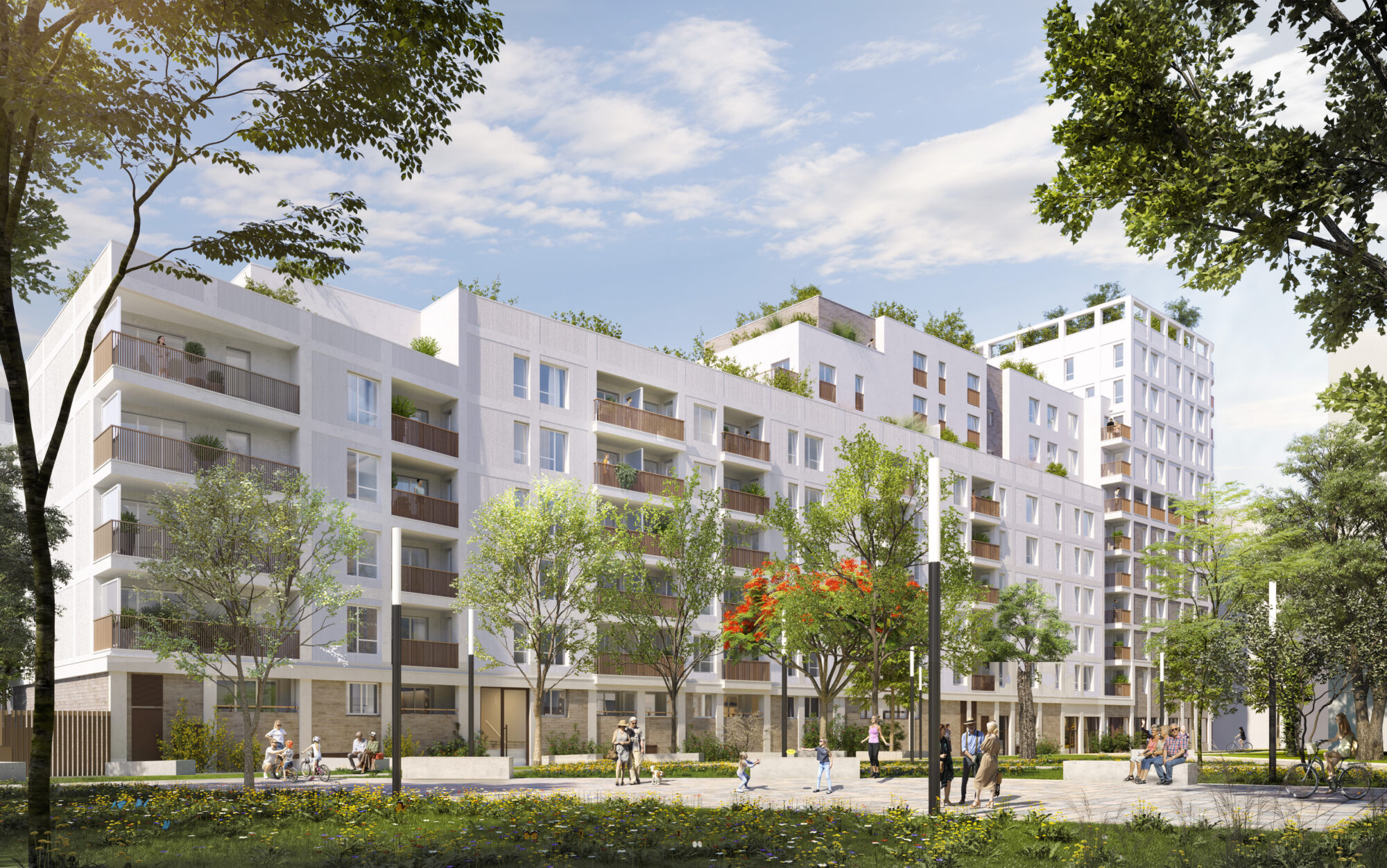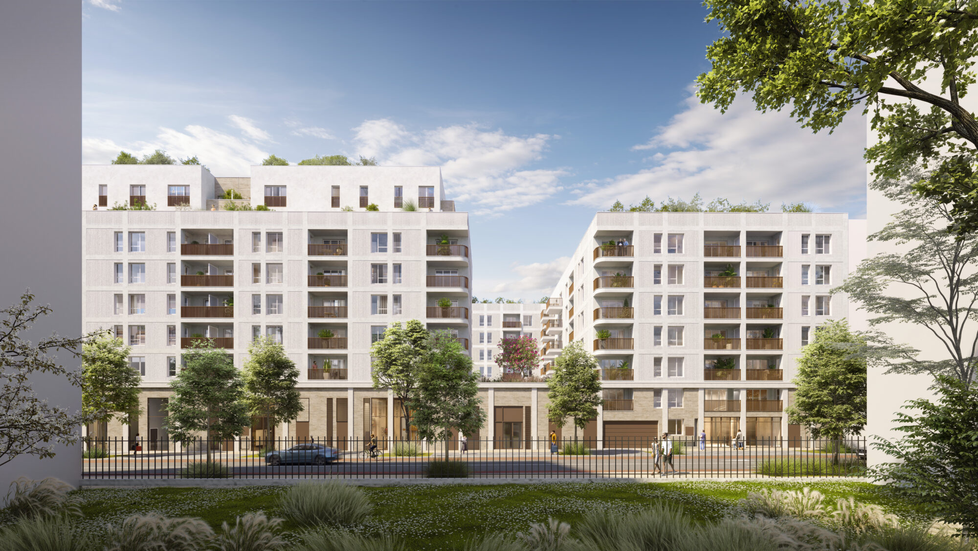 Les aménagements paysagers assurent la continuité des espaces verts, favorisant l’intégration du projet dans son environnement naturel et urbain.