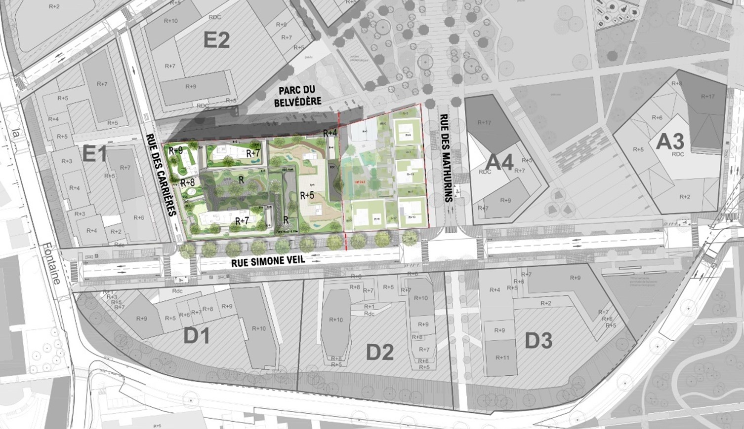 Au cœur du nouveau quartier de la colline des Mathurins à Bagneux, le projet s’inscrit dans un site aux forts enjeux topographiques, marqué par un dénivelé de 1,80 mètre entre la rue Simone Veil et le parc du Belvédère.
