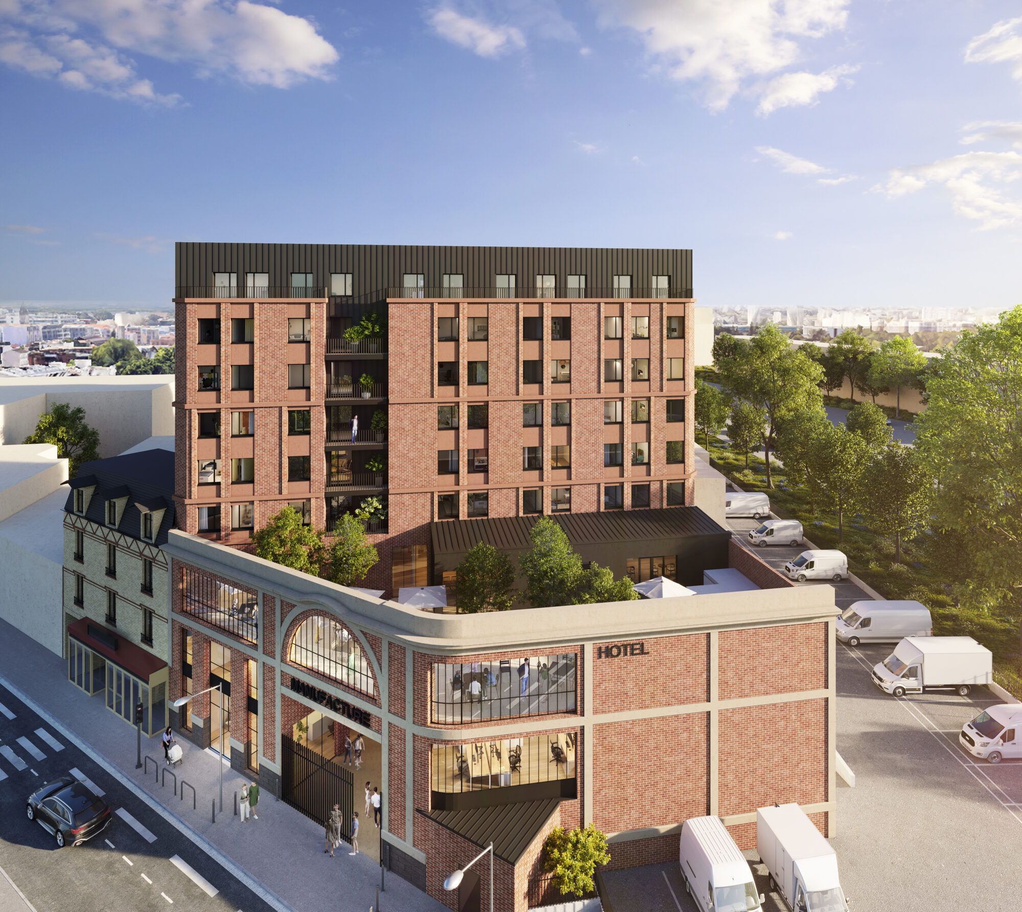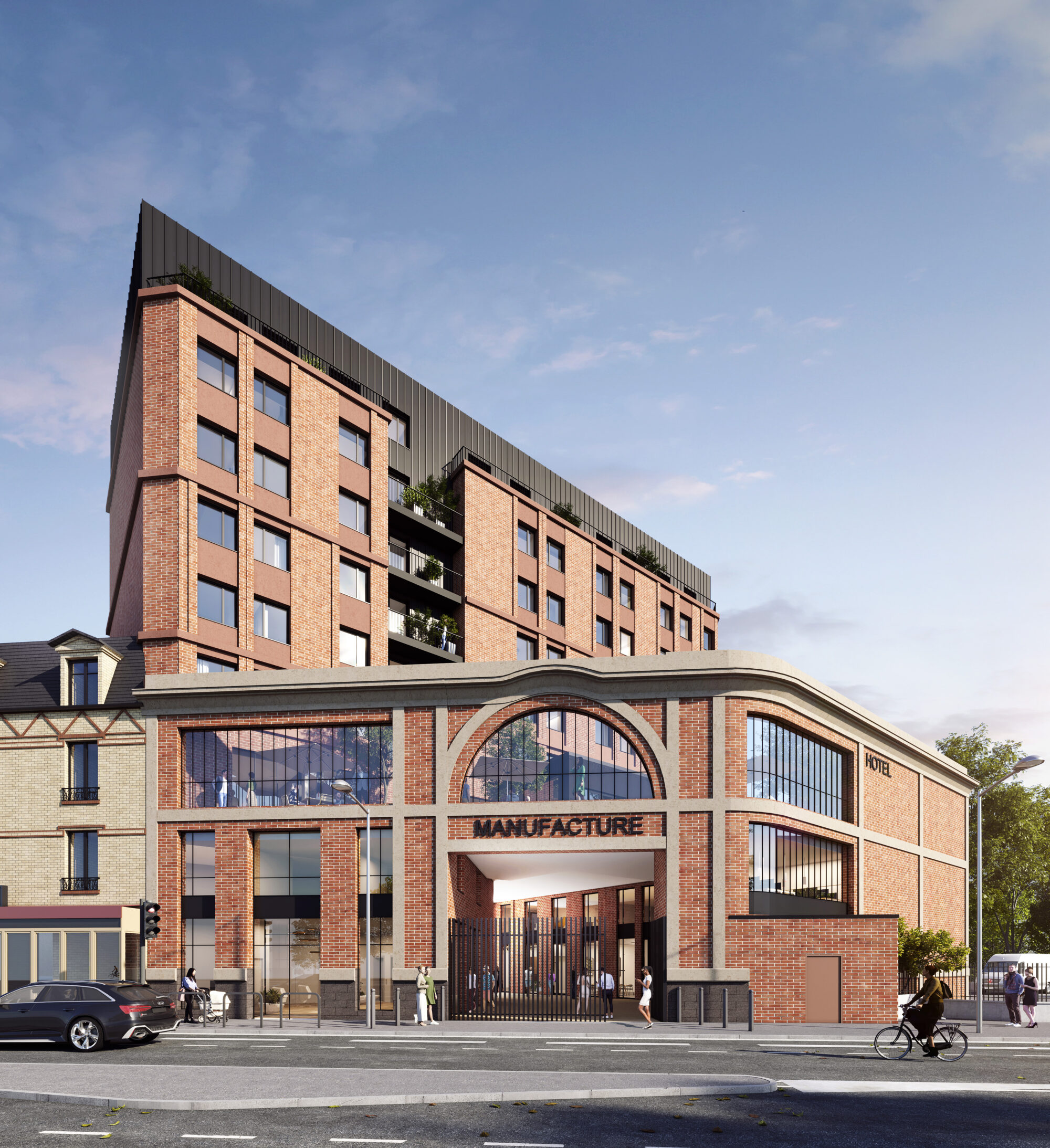 L’un des éléments structurants du projet est la façade historique de l’ancienne manufacture, construite en 1930. Composée de brique rouge, de verrières et de bandeaux blancs, elle témoigne du patrimoine industriel du début du XXe siècle.
