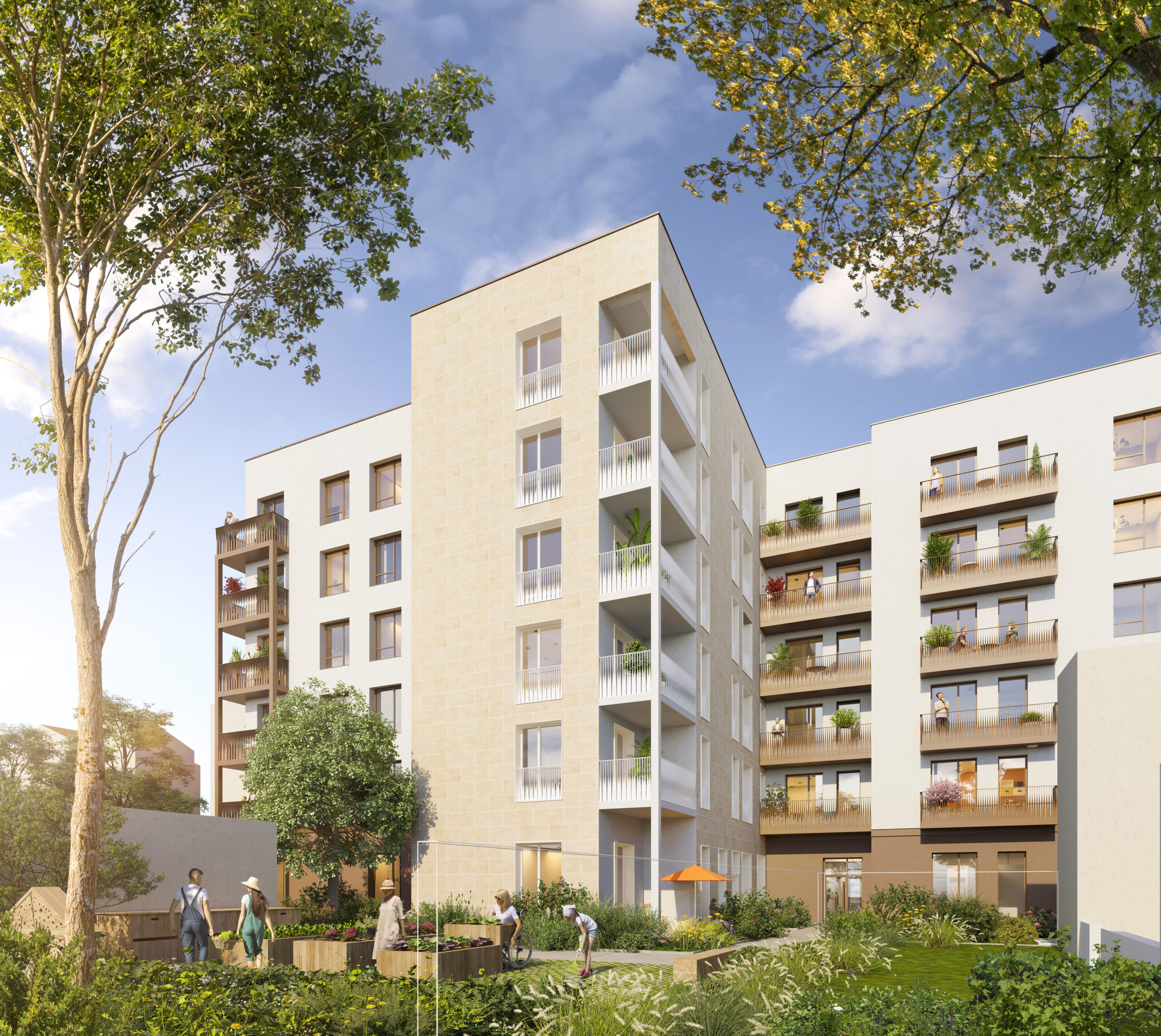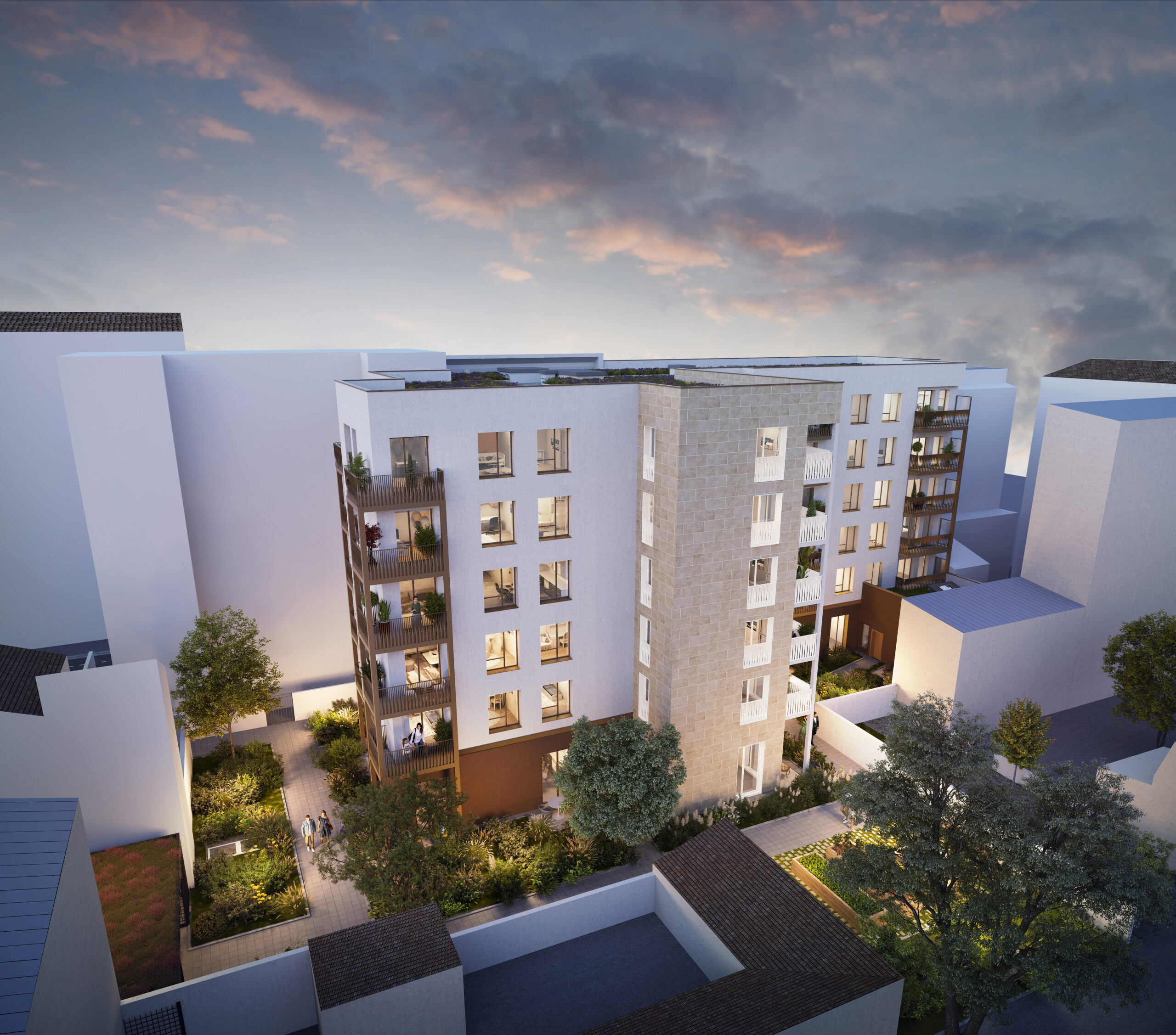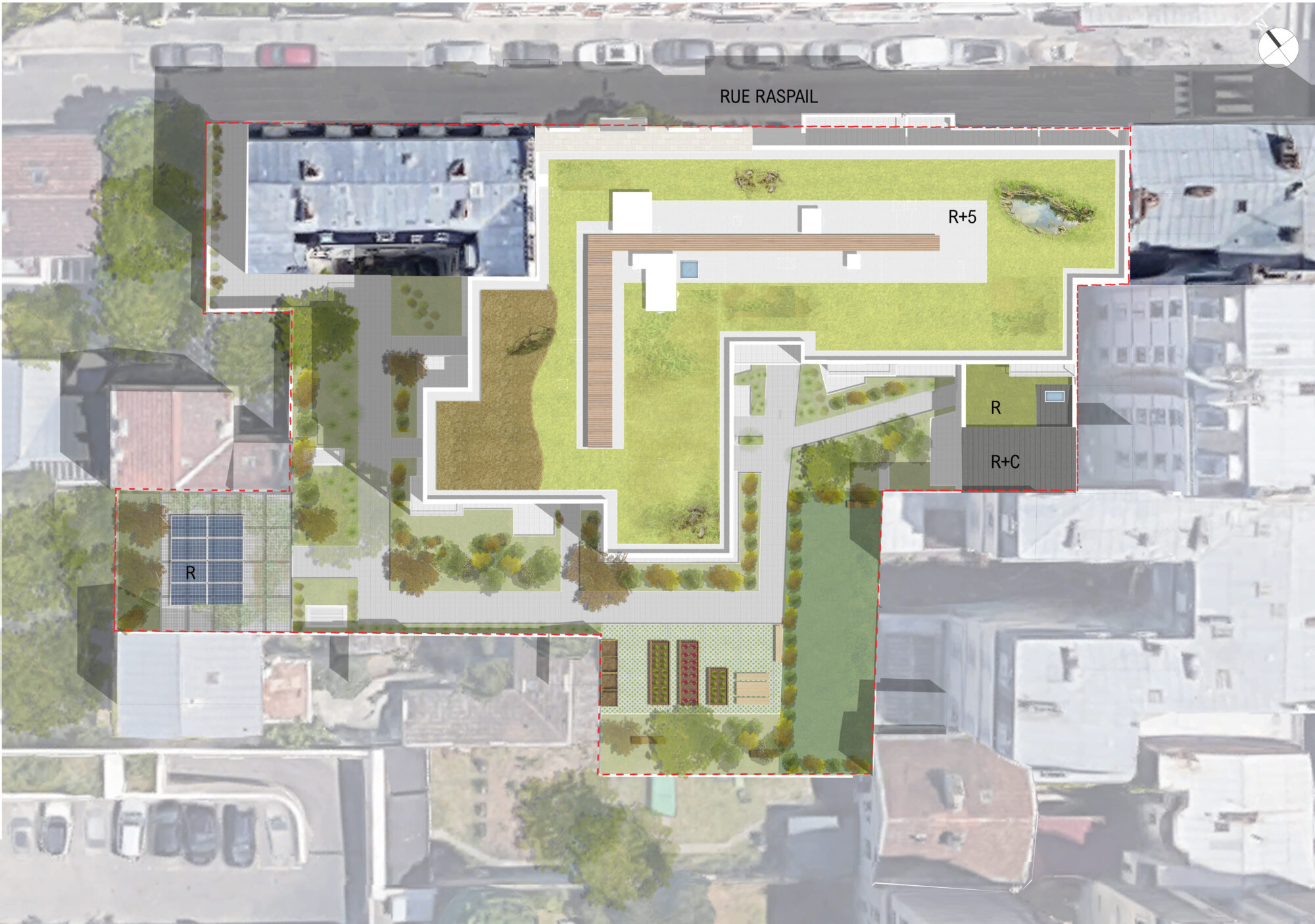 Dans un tissu urbain dense, le projet propose une couture fine entre ville et nature. Il s’intègre dans le paysage de la rue Raspail en s’alignant sur les héberges existantes, tout en séquençant ses volumes. Le cœur d’îlot accueille un jardin partagé, un potager participatif et un local vélos végétalisé, favorisant la biodiversité et les rencontres entre habitants.