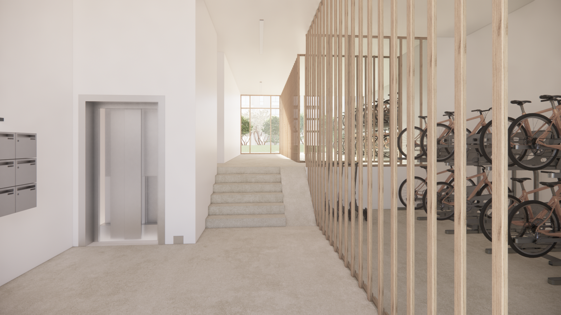 Une attention particulière est portée à l’éco-mobilité avec des locaux vélos ouverts et visibles, favorisant des usages durables et fluides au sein de l’îlot.