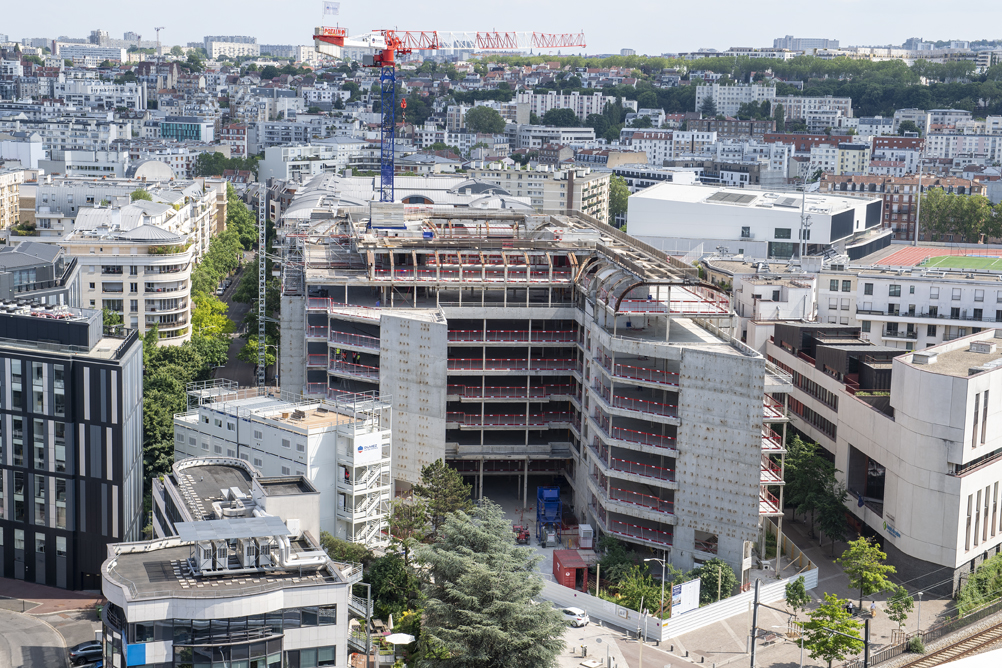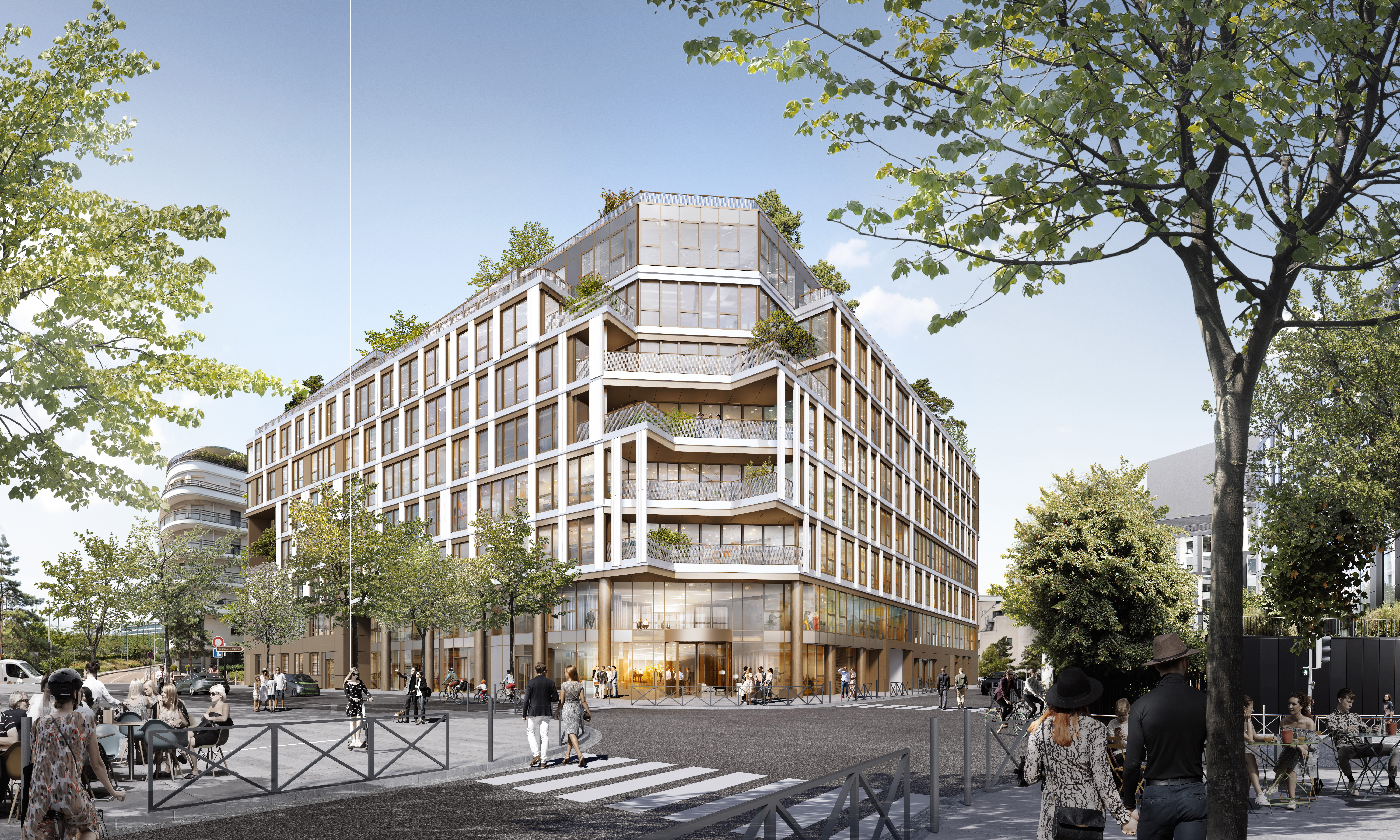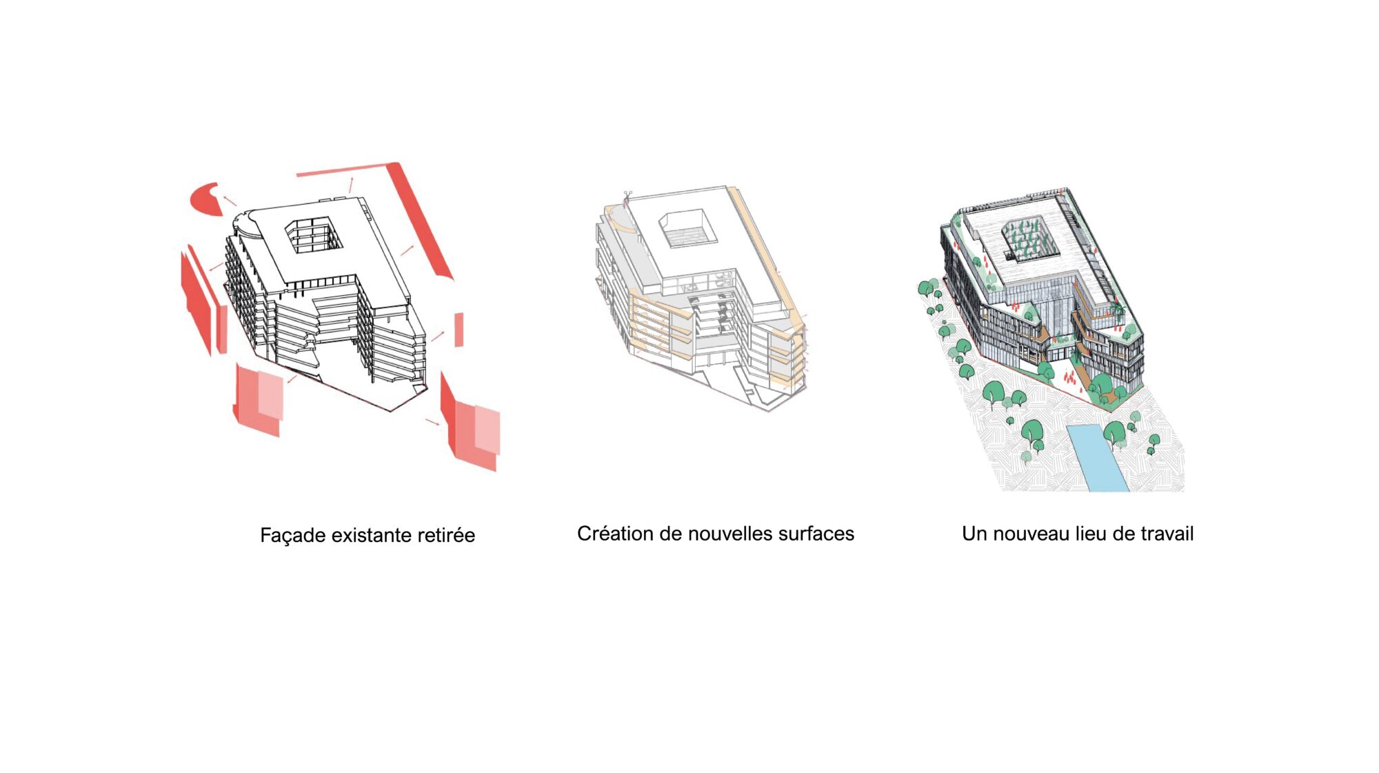 L’intervention vise à requalifier le bâtiment existant — ancien siège de Canal+ — en repensant ses usages, sa performance énergétique et son rapport au quartier. L’enveloppe est entièrement retravaillée, intégrant des façades en terre cuite, verre et métal bronze, des balcons végétalisés et un travail sur la volumétrie en strates, introduisant des terrasses et jardins suspendus à tous les niveaux.