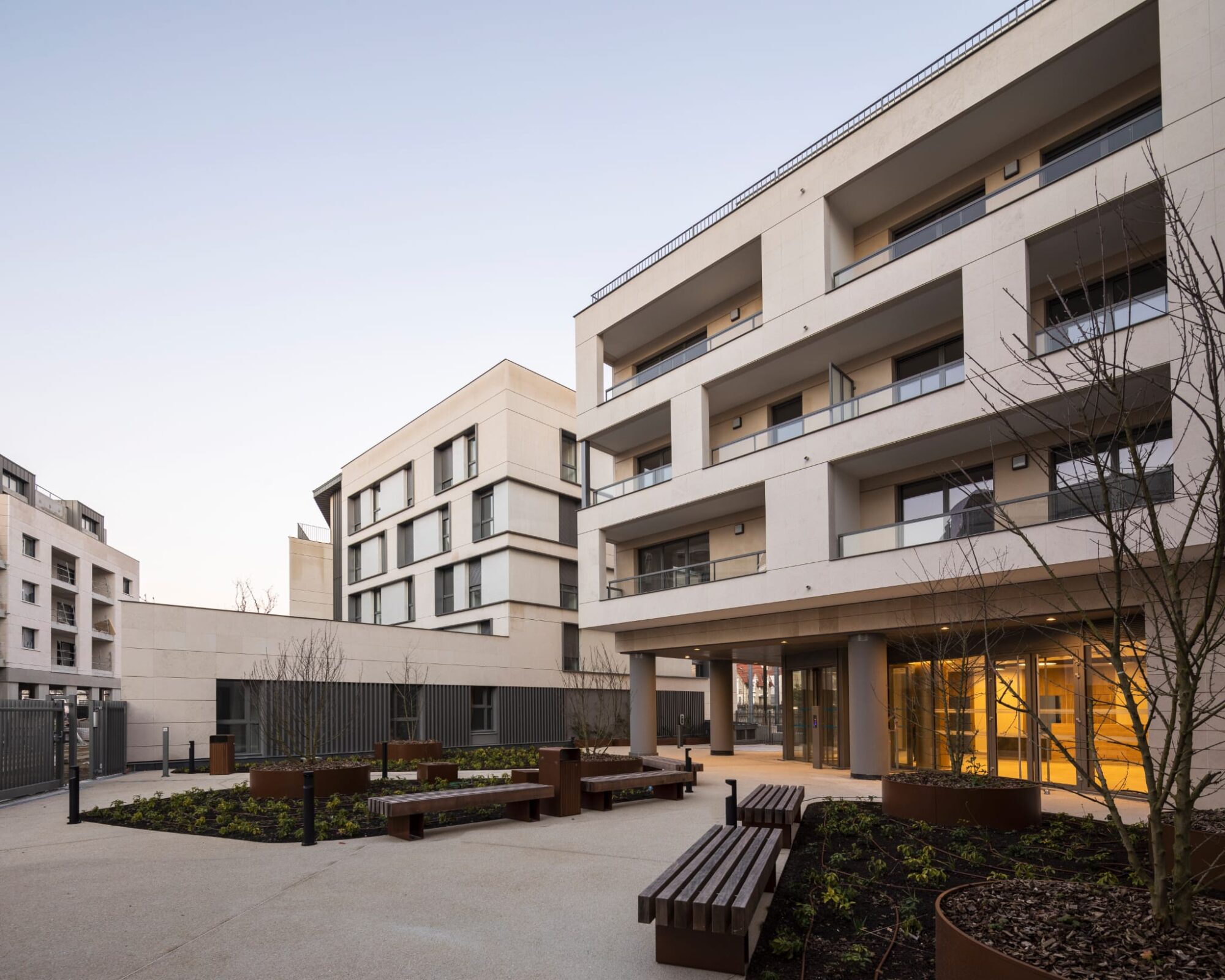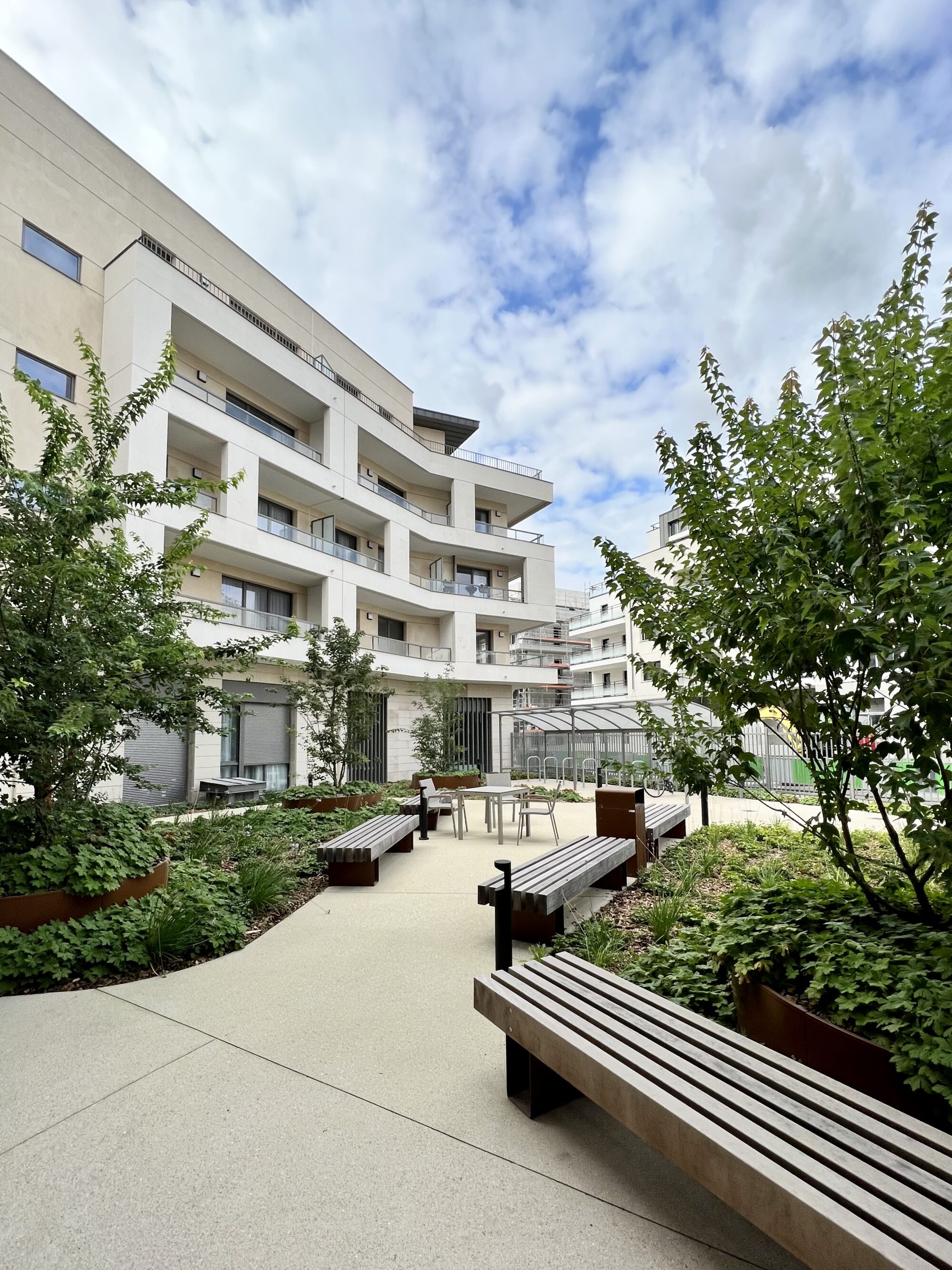 Implanté en lisière de la ZAC des Facultés et des voies du RER A, le projet s’inscrit en interface directe avec le futur parc, dont il constitue à la fois un écran visuel et acoustique. L’implantation du bâtiment tire parti de la géométrie de la parcelle : la façade principale s’aligne sur la rue Benjamin Franklin, tandis qu’un volume en retour vient cadrer le parc et positionner l’entrée sur le mail piétonnier.