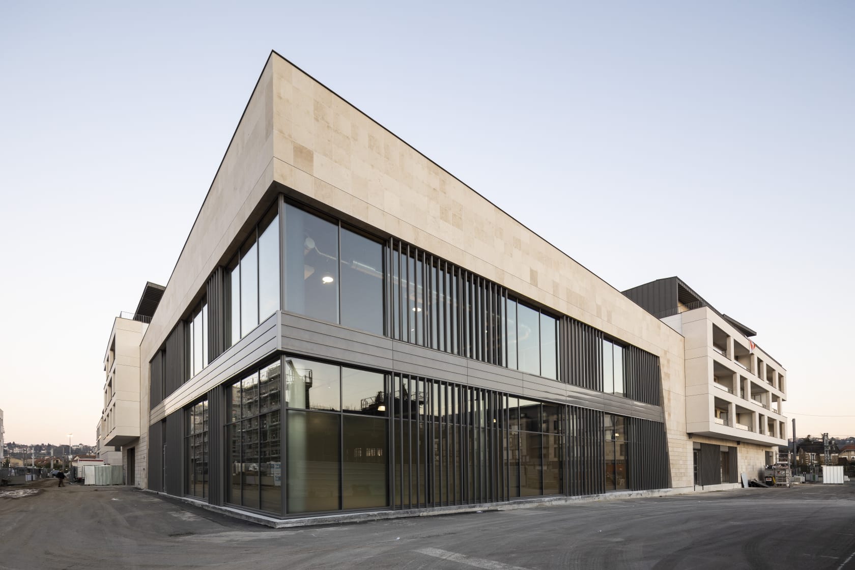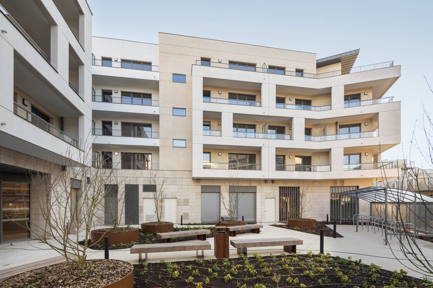 L’architecture adopte une écriture contemporaine, tout en intégrant des éléments de composition classique pour assurer une lecture cohérente du projet dans son environnement. Le choix de la pierre semi-porteuse, largement déployée en façade, prolonge les références locales et s’inscrit dans la continuité constructive de Saint-Maur-des-Fossés.