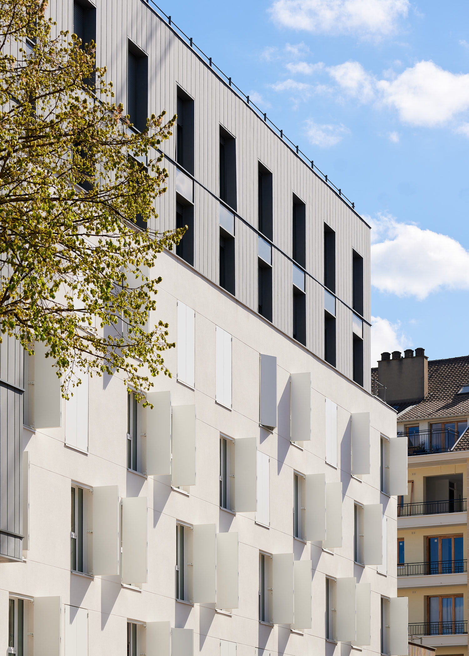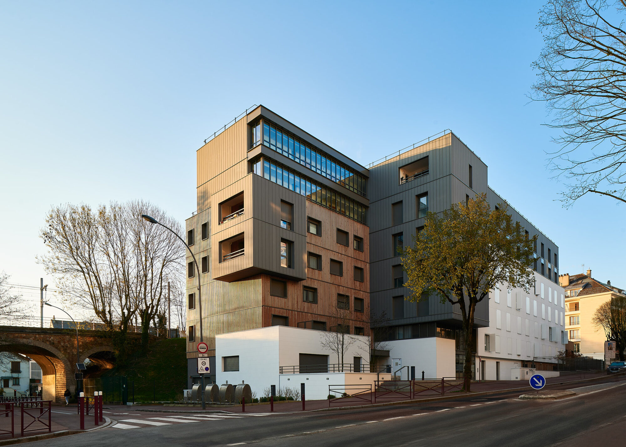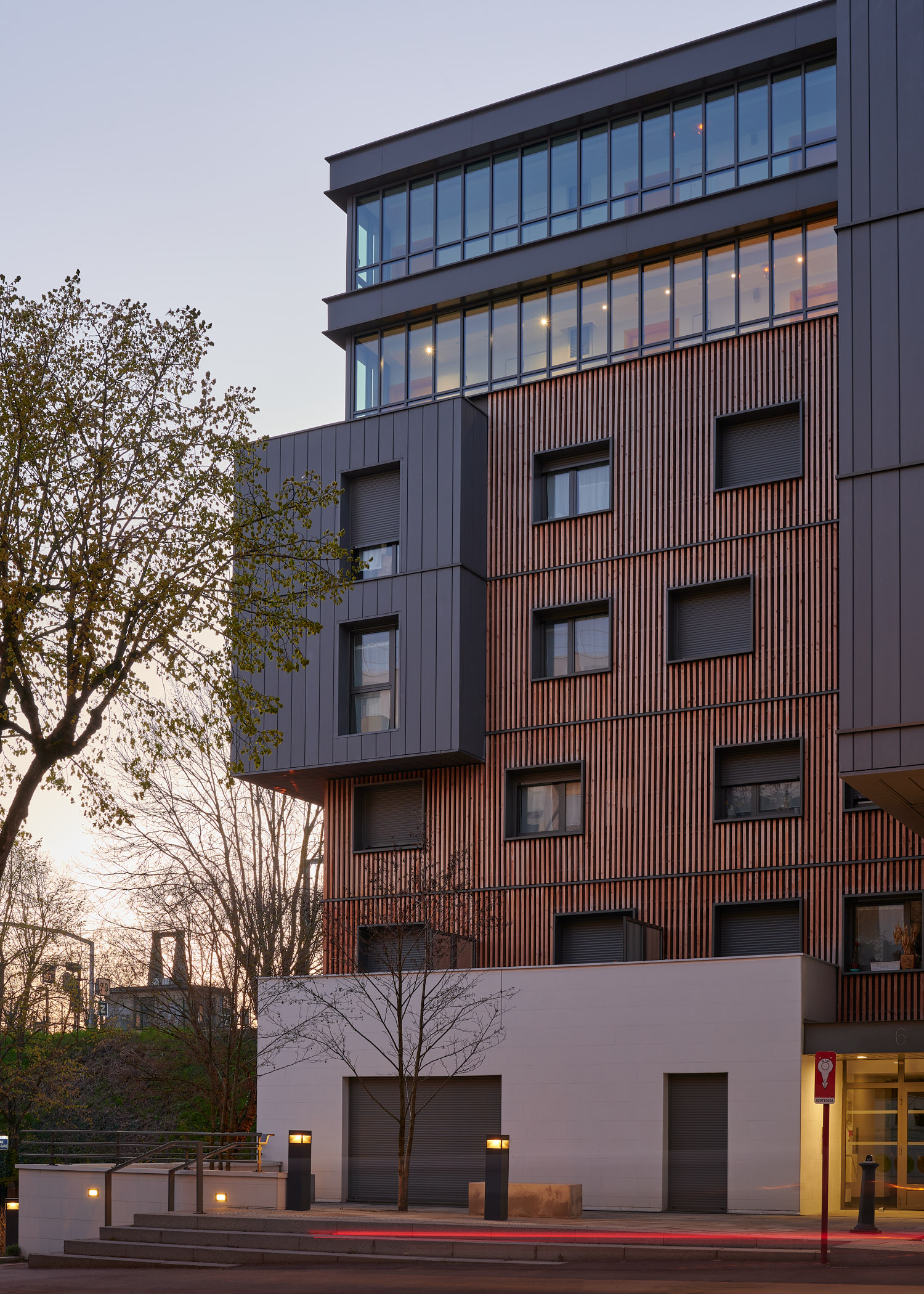 La densité du programme, en lien direct avec les capacités de constructibilité de la parcelle, a conduit à exploiter la hauteur maximale autorisée dans ce secteur. Pour éviter toute sensation de masse et préserver une échelle urbaine maîtrisée, les volumes principaux ont été décalés et différenciés par un travail sur les matériaux de façade.