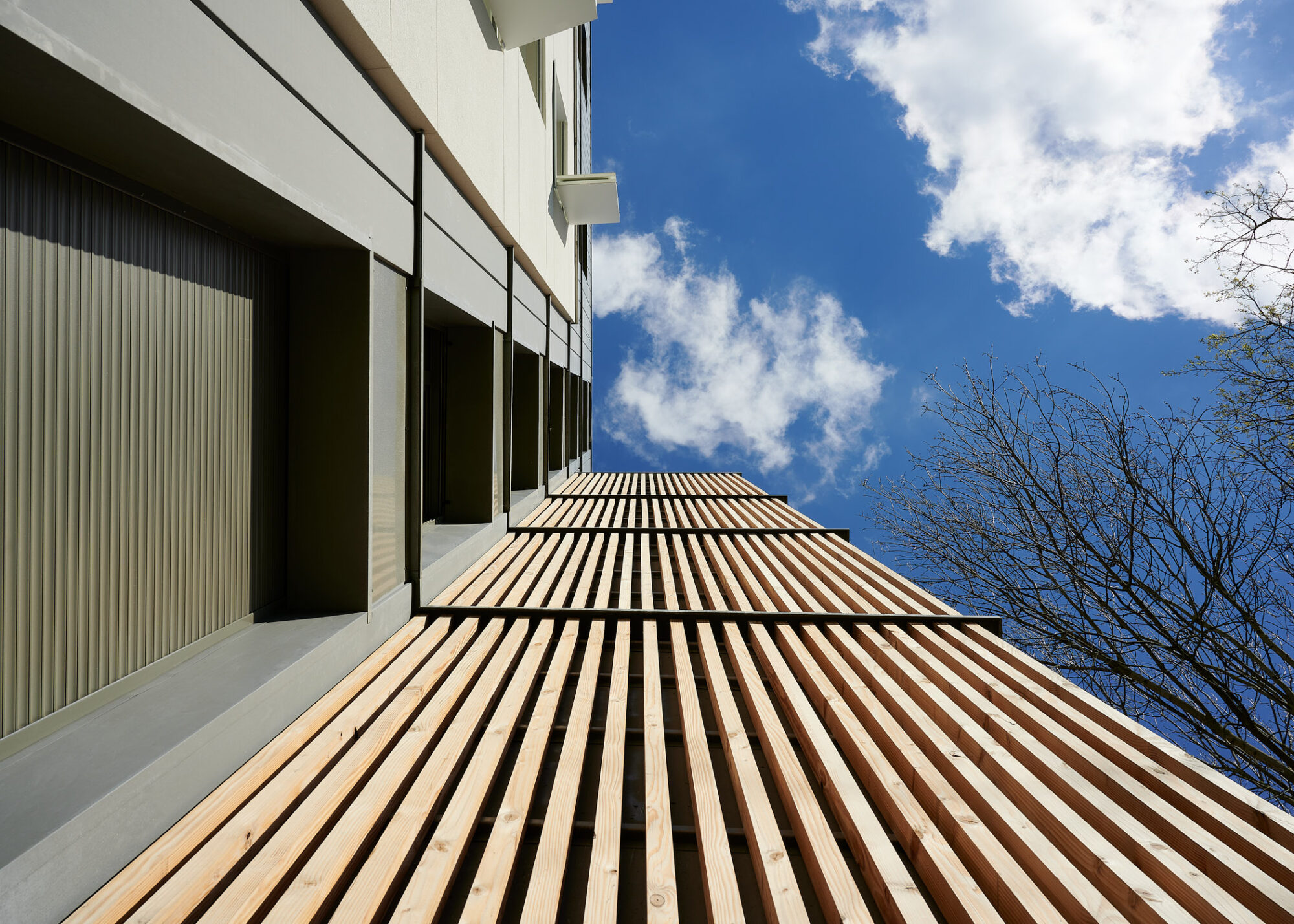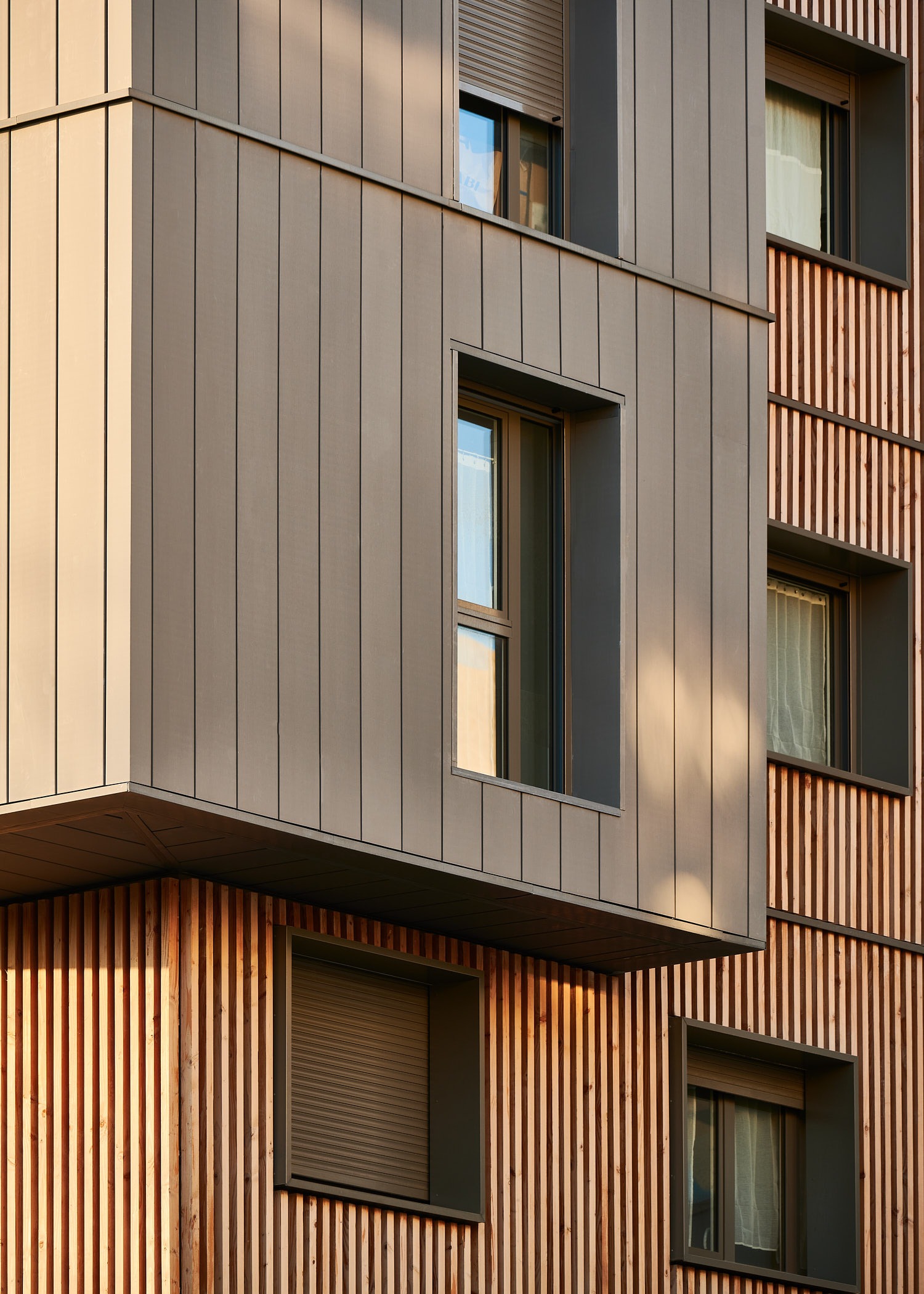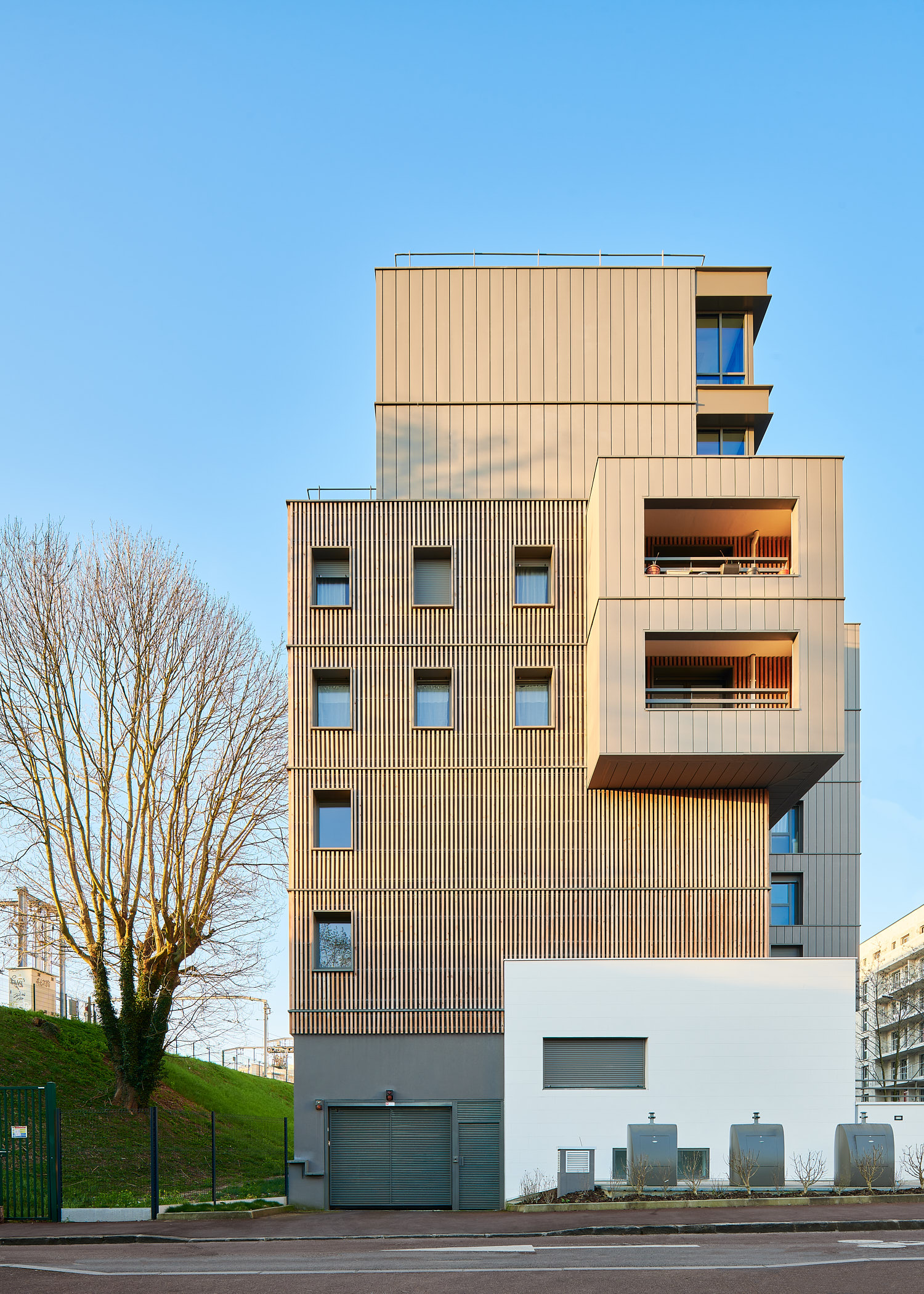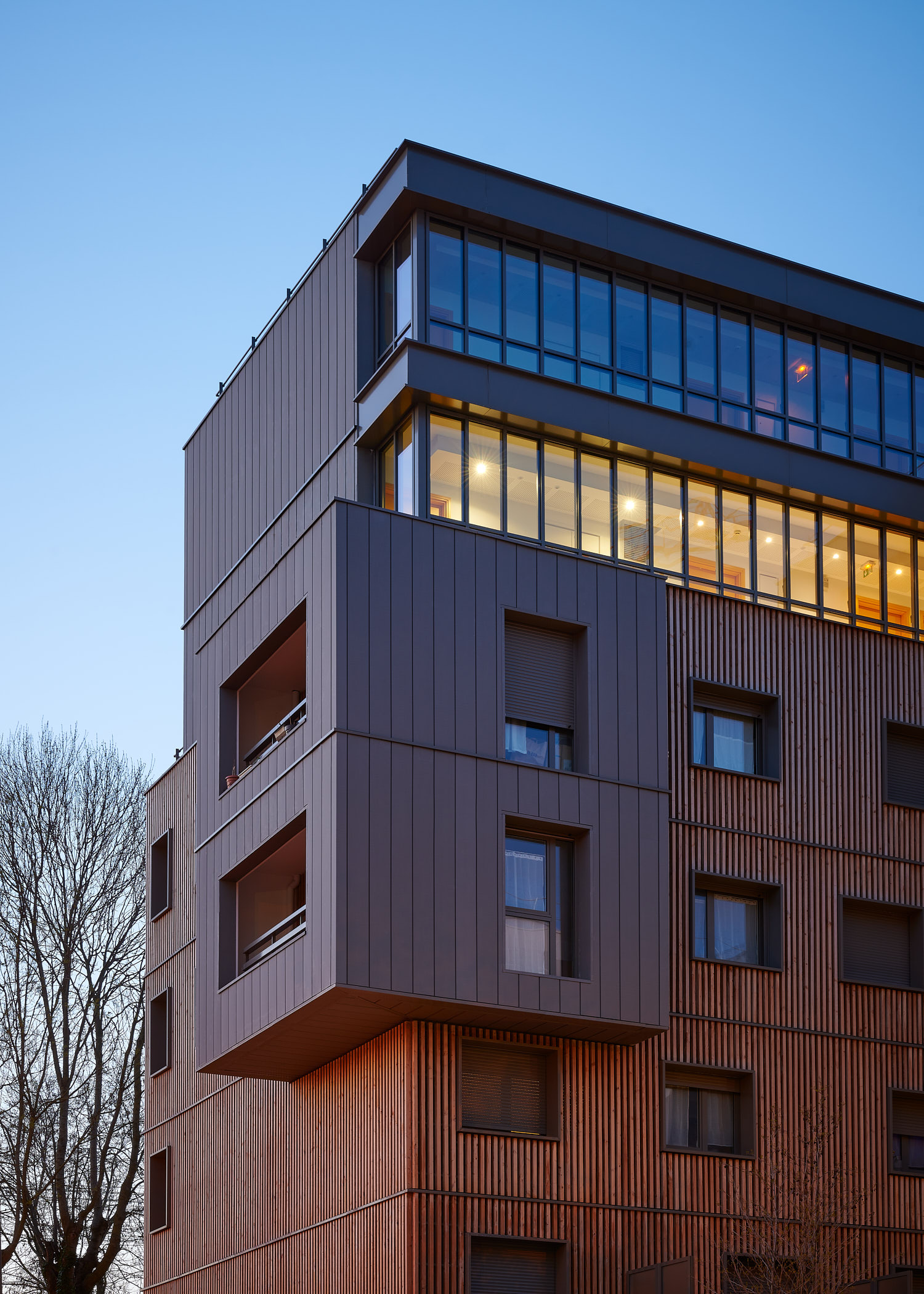 La densité du programme, en lien direct avec les capacités de constructibilité de la parcelle, a conduit à exploiter la hauteur maximale autorisée dans ce secteur. Pour éviter toute sensation de masse et préserver une échelle urbaine maîtrisée, les volumes principaux ont été décalés et différenciés par un travail sur les matériaux de façade.