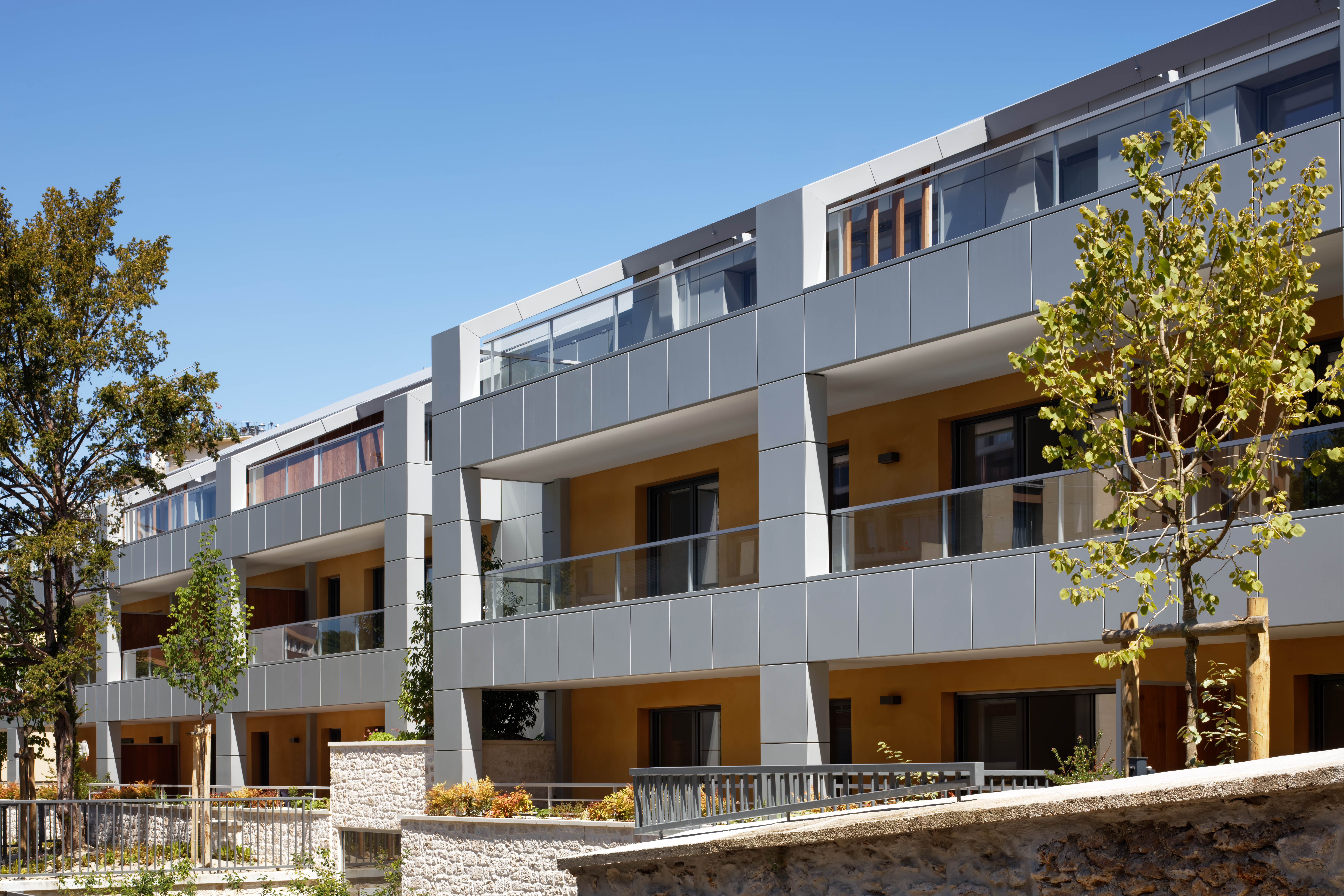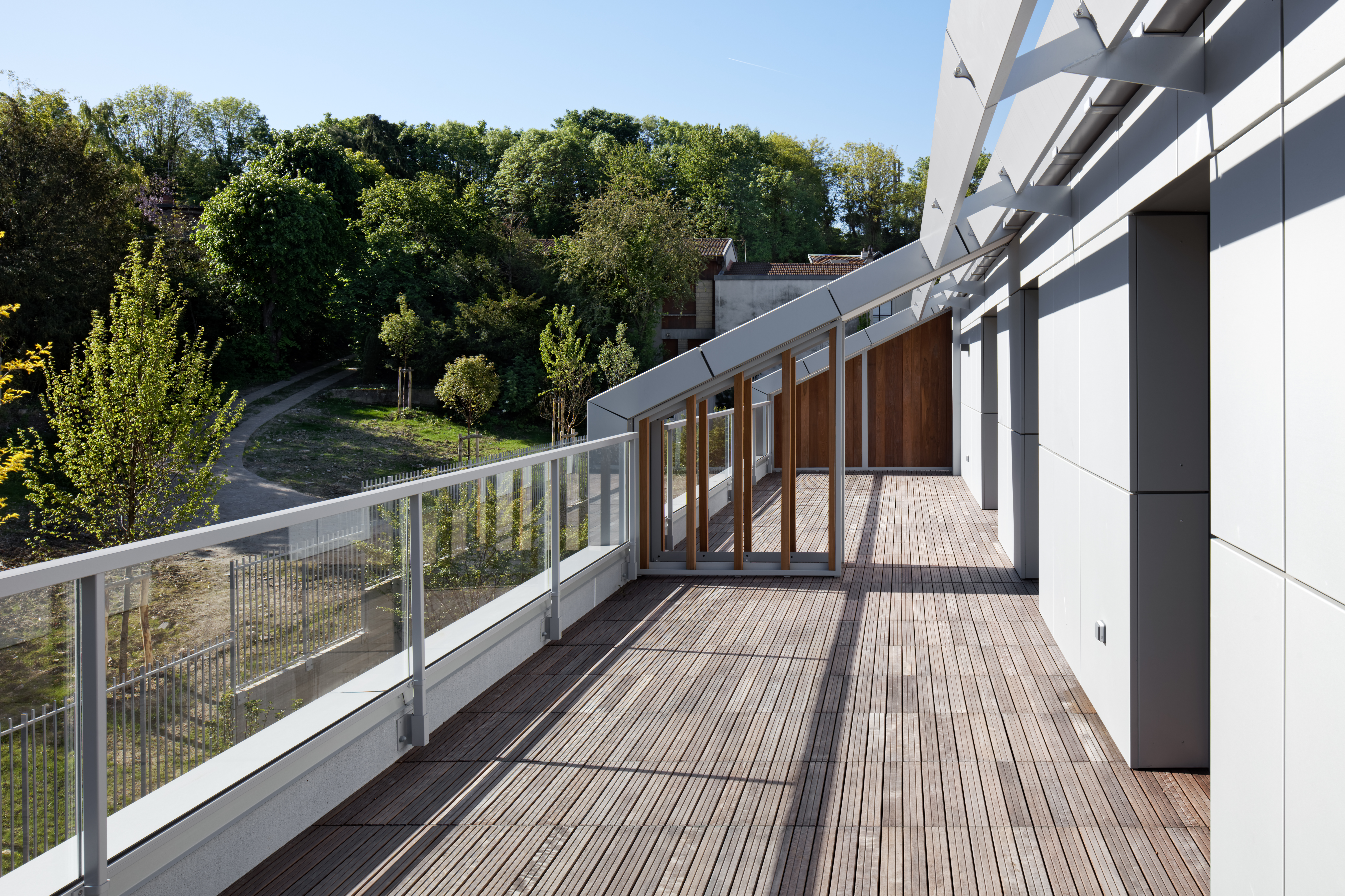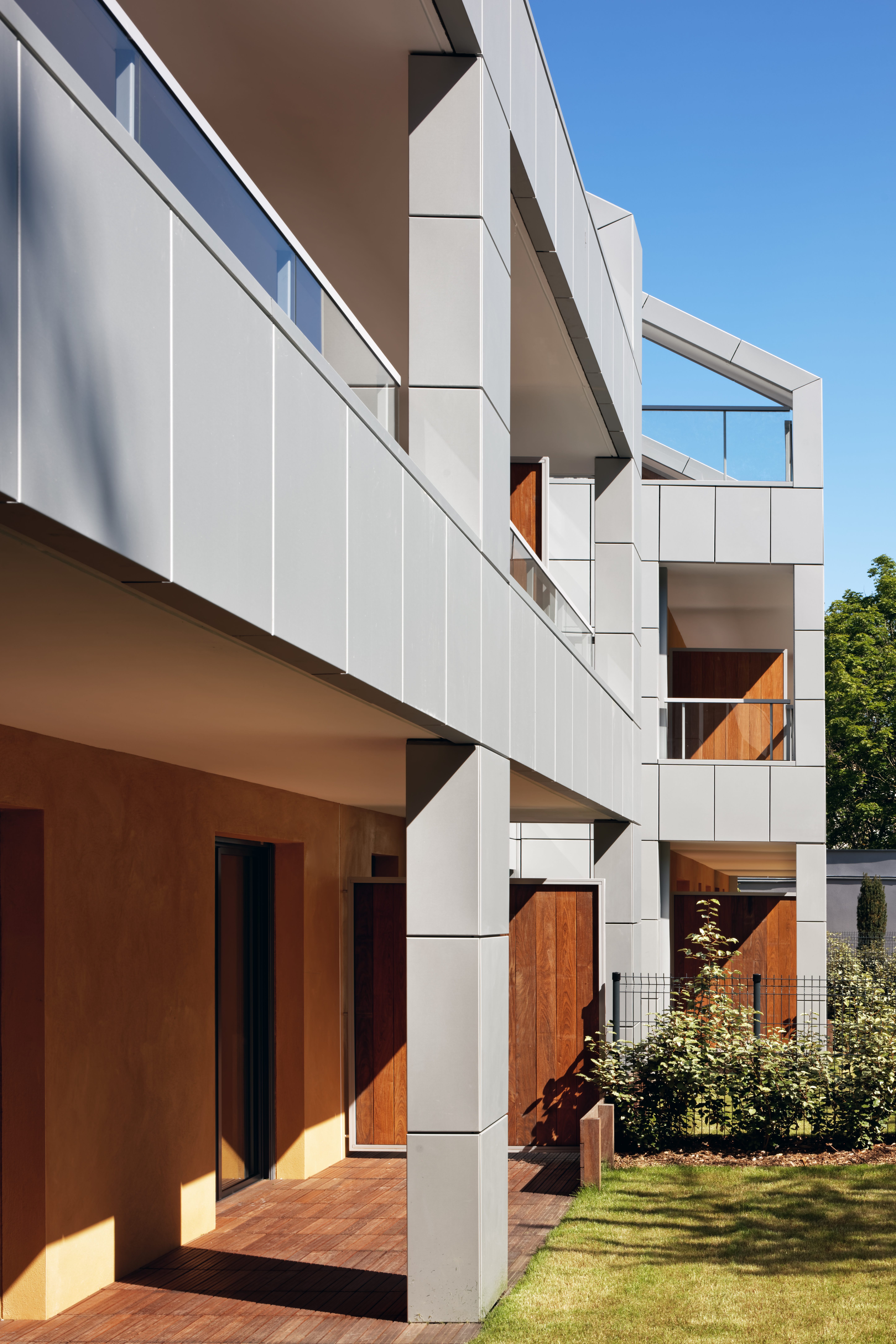 Les volumes présentent des toitures en pente et sont habillés de cassettes en aluminium ton naturel, affirmant une écriture en harmonie avec le contexte environnant. De larges coursives périphériques, au sol en bois et aux allèges vitrées, entourent les logements et offrent à la fois des prolongements extérieurs généreux et une mise en mouvement subtile des façades.