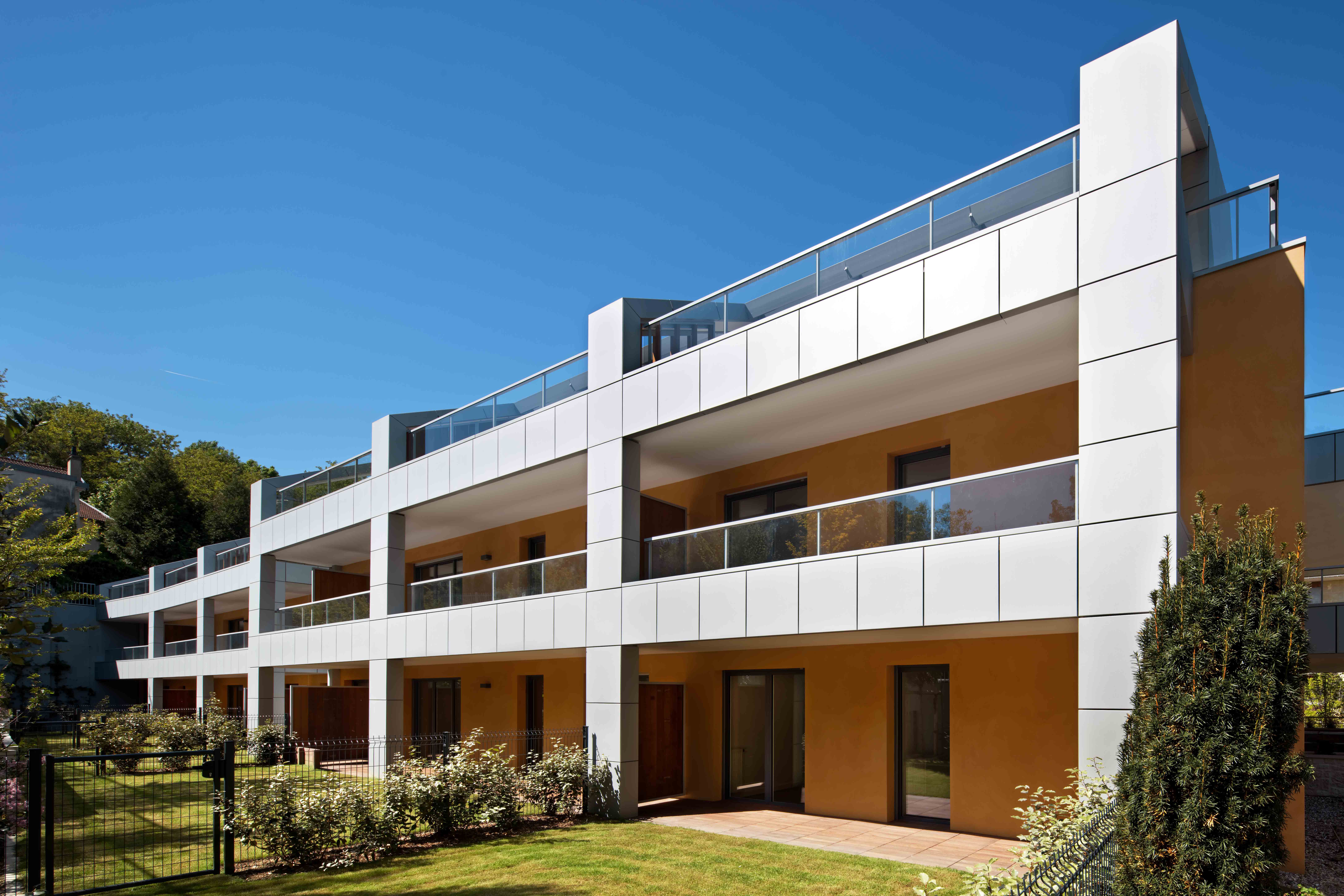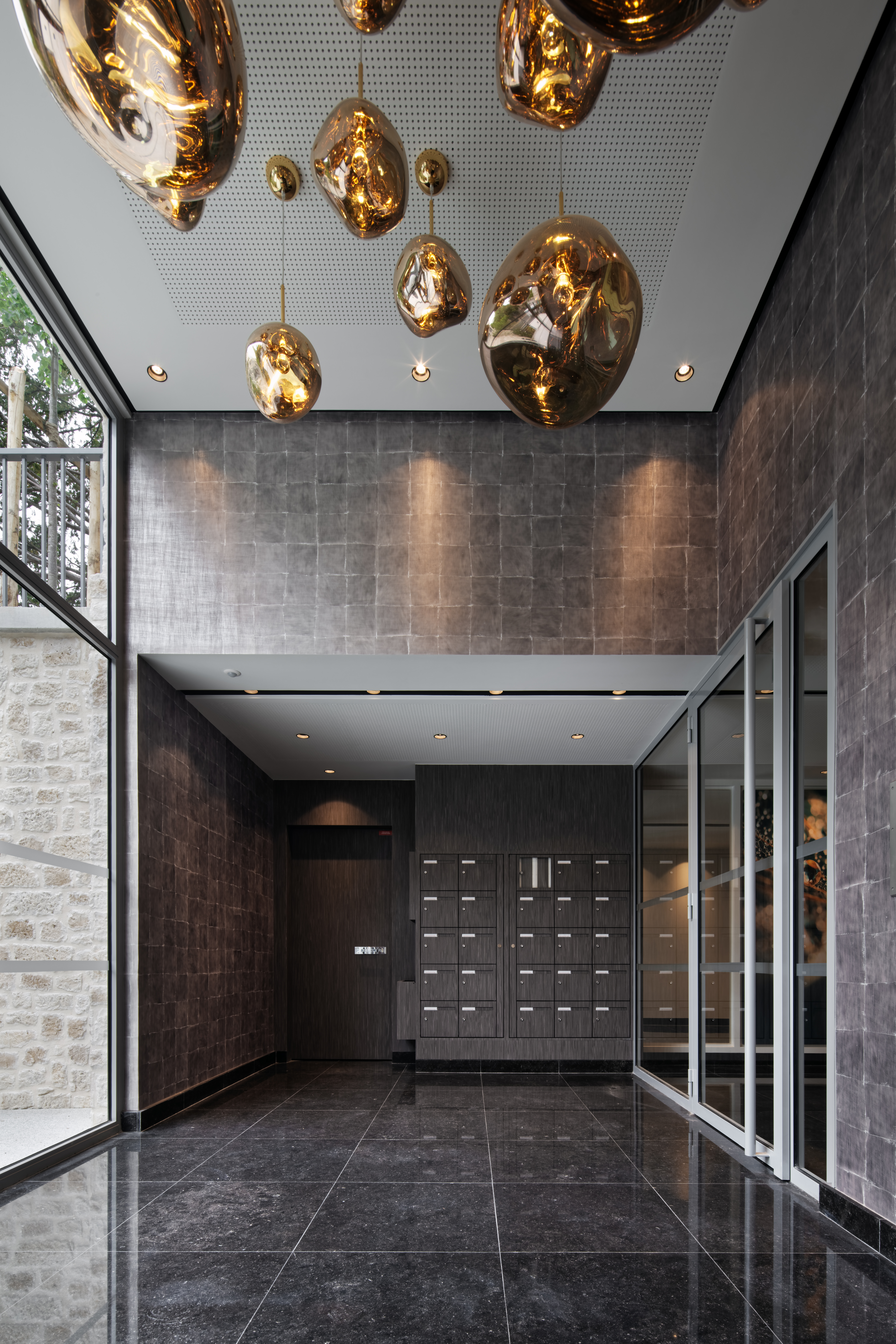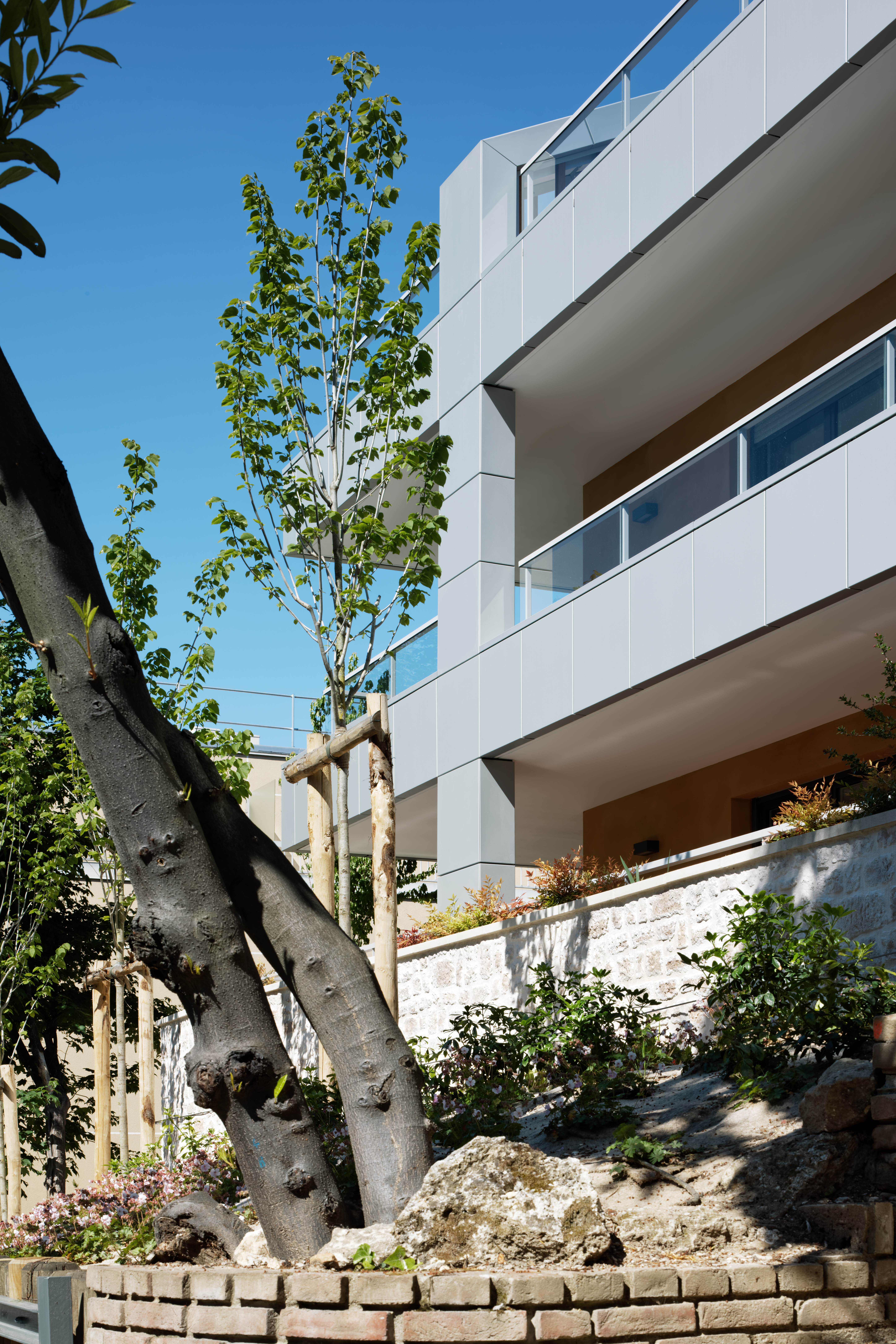 Les volumes présentent des toitures en pente et sont habillés de cassettes en aluminium ton naturel, affirmant une écriture en harmonie avec le contexte environnant. De larges coursives périphériques, au sol en bois et aux allèges vitrées, entourent les logements et offrent à la fois des prolongements extérieurs généreux et une mise en mouvement subtile des façades.